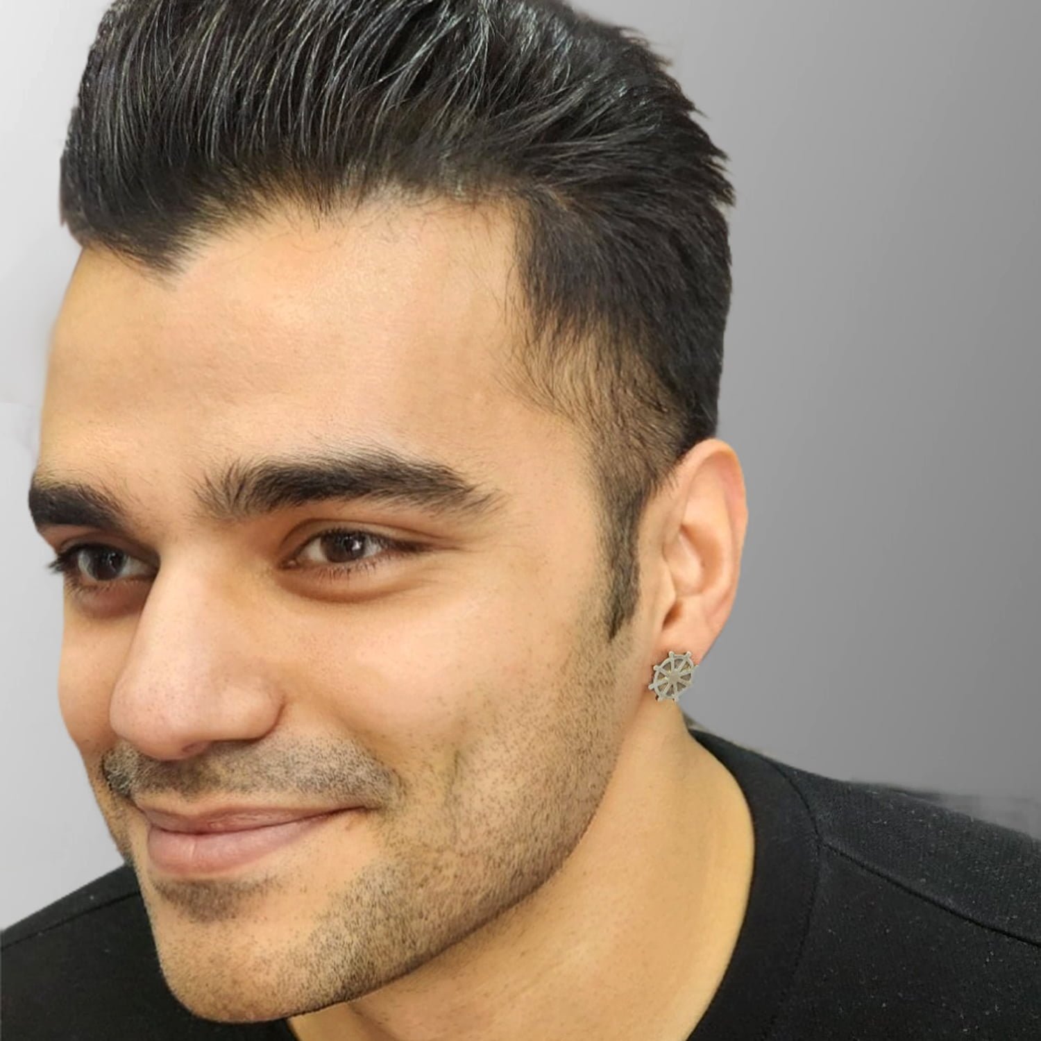 Introducing the Dharmachakra Boys Stud Earrings Design in Silver, a blend of elegance and spirituality crafted for the discerning artisan lover. Embrace the timeless allure of these exquisite earrings, finely designed to encapsulate the essence of Buddhist symbolism with a contemporary twist.