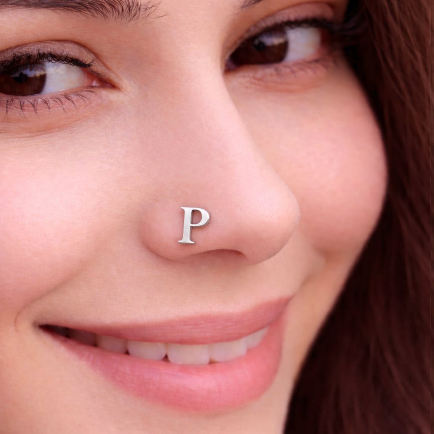Alphabet P Design: Embrace yourself with personalised brass metal or alphabet P sterling silver nosepin. Adding sophistication to your style. Meticulously crafted for a feminine look. CLICK TO SEE MORE DESIGNS
